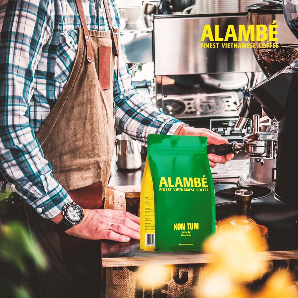 Cà phê Kon Tum ALAMBÉ được làm từ những hạt cà phê Robusta được thu mua trực tiếp từ nông dân ở Kon Tum. Trái cà phê sau khi thu hoạch sẽ được loại bỏ lớp vỏ bên ngoài nhưng giữ lại lớp chất nhầy sau đó phơi dưới ánh sáng mặt trời, lớp chất nhầy trong quá trình phơi sẽ thấm vào bên trong hạt nhân, giúp cà phê có vị ngọt hơn những phương pháp sơ chế thông thường khác. Sự cẩn trọng trong từng mẻ rang sẽ giúp cà phê Kon Tum của ALAMBÉ đạt được chất lượng tốt nhất, phù hợp với thức uống Latte và Cappuccino. Bên cạnh đó, bạn cũng có thể khám phá sự khác biệt đáng ngạc nhiên trong hương vị với một tách kiểu Americano hoặc Cafe crème.