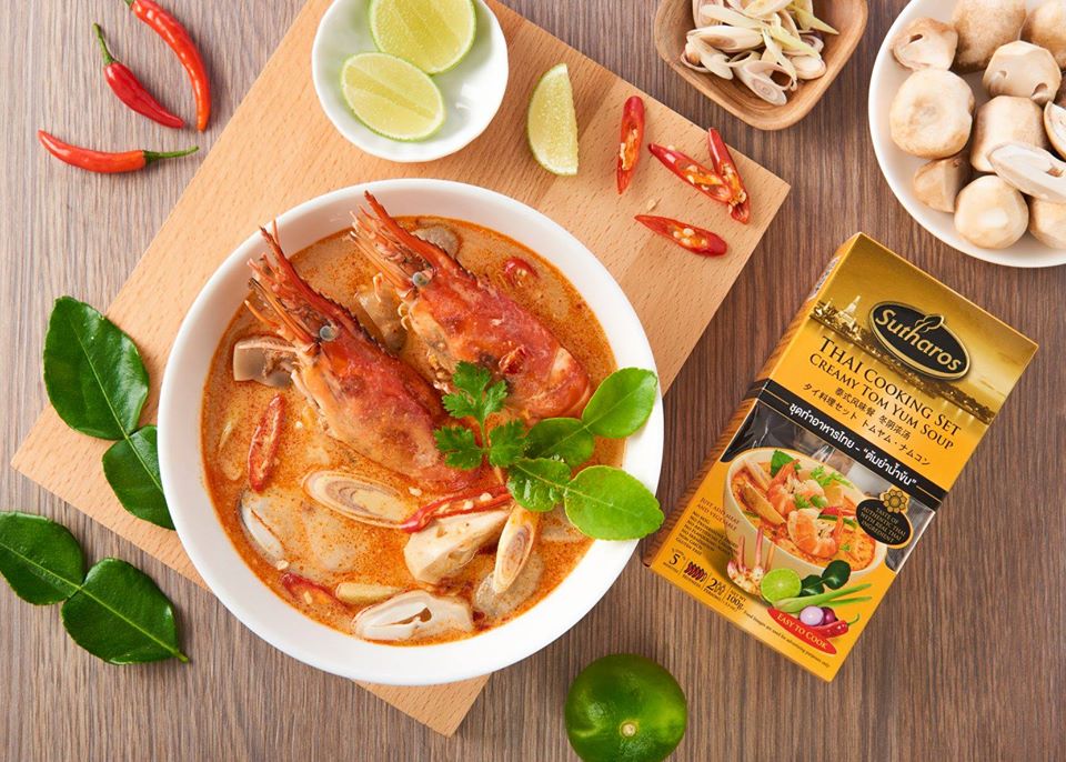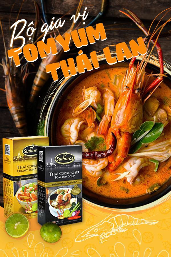 Tom Yum – Món canh chua cay ăn nóng mang tinh hoa của nền ẩm thực xứ sở Chùa Vàng – Nhiều năm liền được tạp chí CNN của Mỹ bình chọn đứng thứ 8 trong top 50 món ăn ngon và phổ biến nhất thể giới – Gia vị Súp Tom Yum của thương hiệu Sutharos là sự kết hợp hài hòa giữa các loại thảo mộc sấy khô và các gia vị truyền thống của người Thái. Tom Yum như một lời khẳng định mạnh mẽ cho ẩm thực Thái với vị cay nồng và chua đặc trưng. Húp 1 muỗng Tom Yum, vị giác của bạn sẽ thức tỉnh ngay lập tức